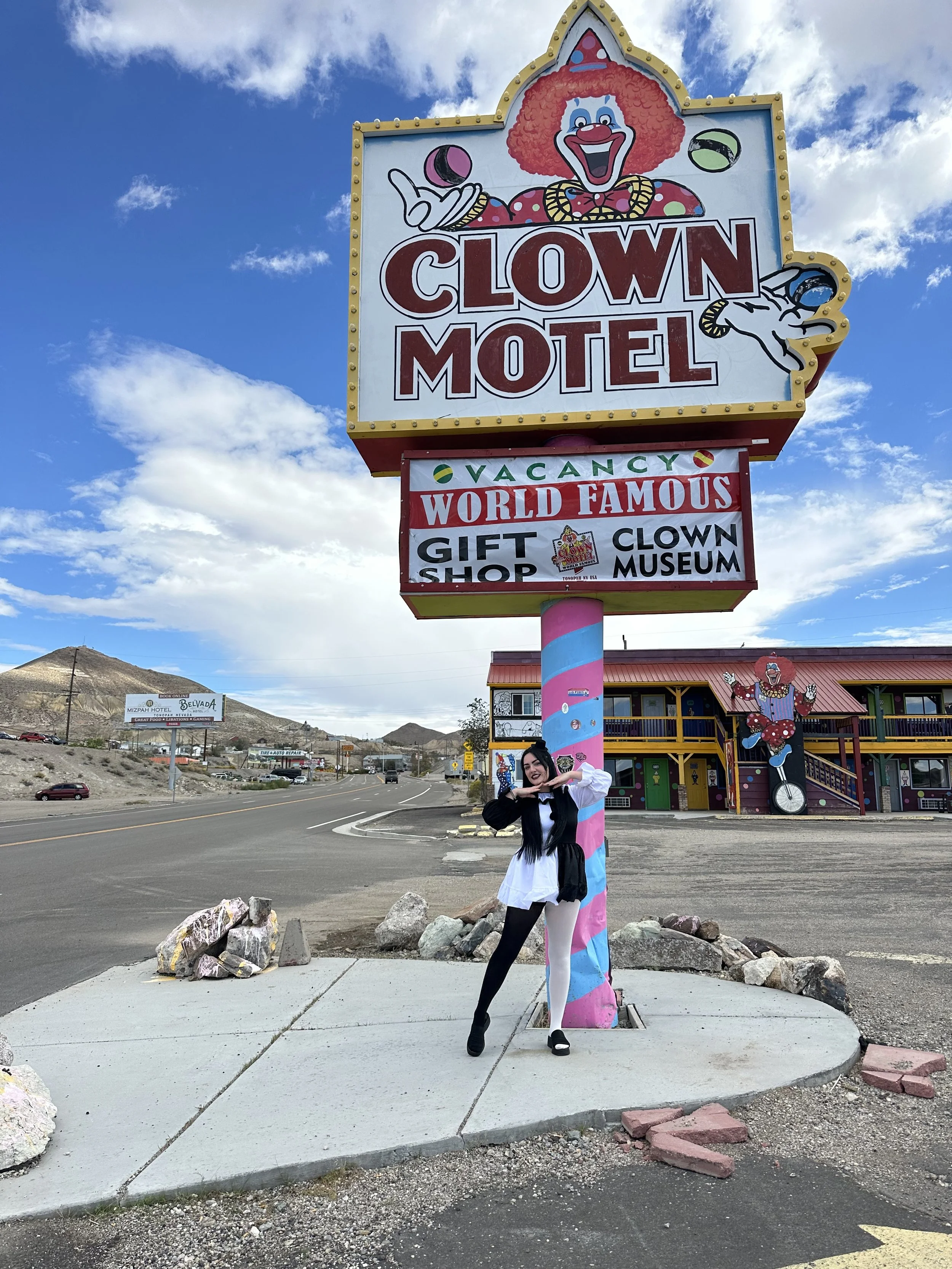 I was lucky to be the passenger princess this time since my husband loves long drives. We stopped at the Clown Motel and Mizpah Hotel in Tonopah. Both are famous for being strangely unique, but they’re genuinely interesting stops. The clown motel shares its property with a cemetery, and the Mizpah is notoriously haunted. We packed our clown costumes for a photo opp and peeked inside the Mizpah on our way to Beatty. But don't forget to stop at he International Car Forest of the Last Church, located right outside Goldfield. It’s a short detour worth taking.